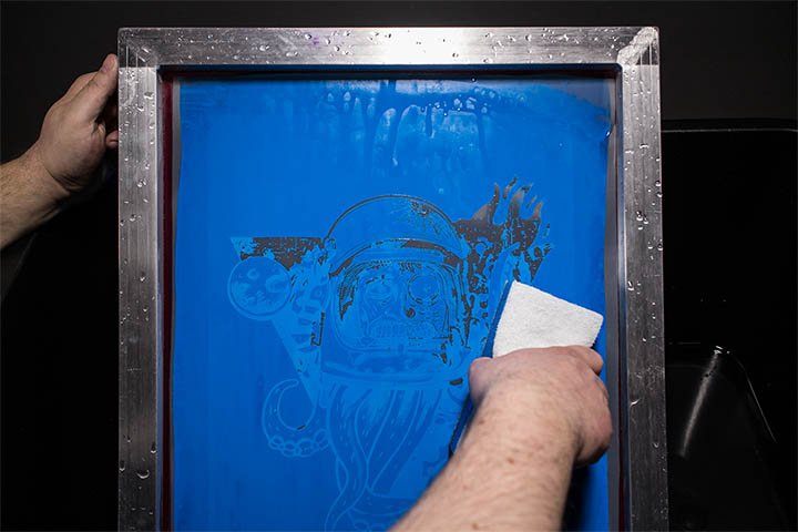 A l’aide d’une racle, la peinture passe à travers les maille du cadre resté vierge et se dépose sur le T-shirt.